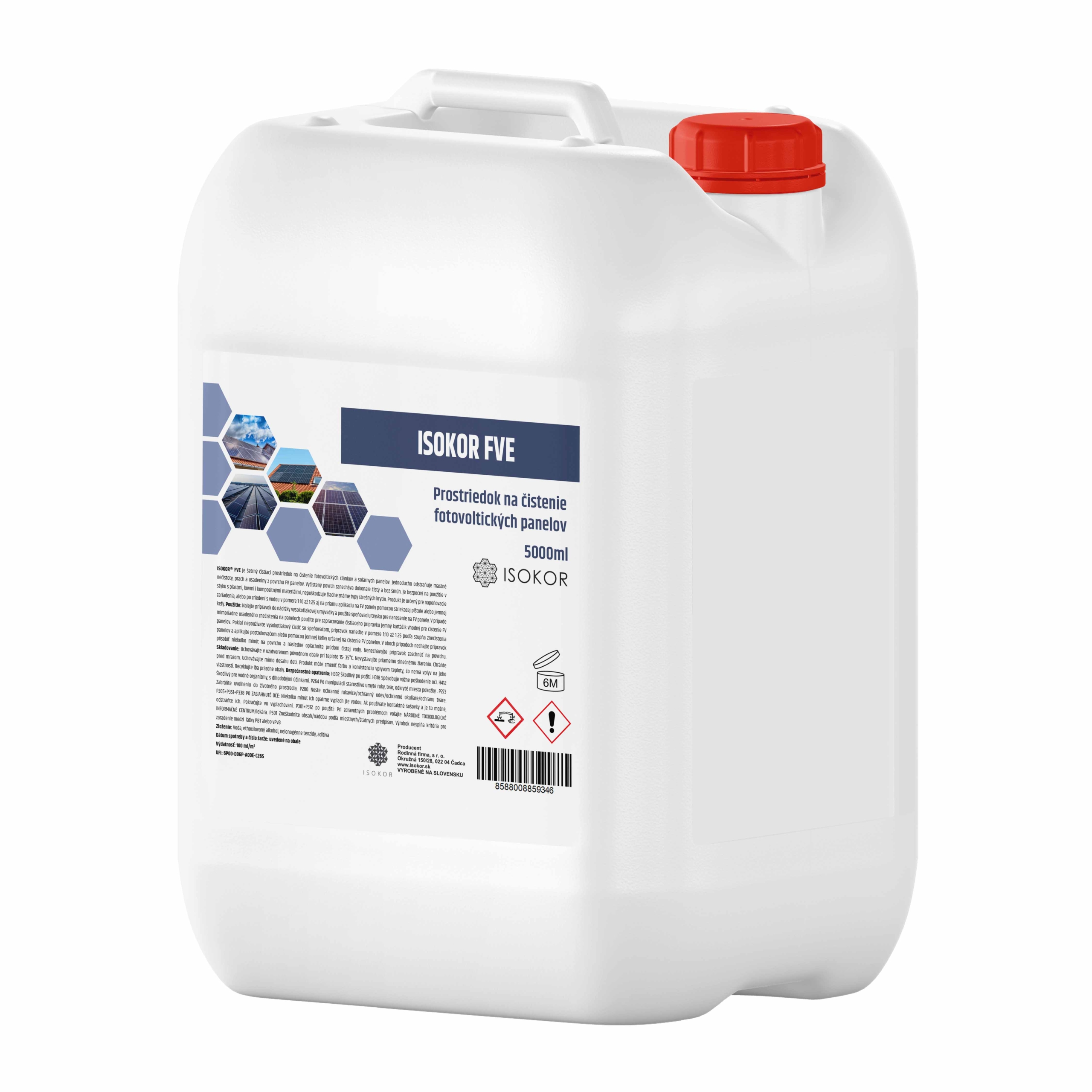 Nalejte koncentrovaný prípravok do nádržky vysokotlakovej umývačky a použite speňovaciu trysku pre nanesenie na FV panely. V prípade mimoriadne usadeného znečistenia na paneloch použite pre zapracovanie čistiaceho prípravku jemný kartáčik vhodný pre čistenie solárnych panelov. Jeden panel takto skonzumuje približne 10ml Isokor FVE.