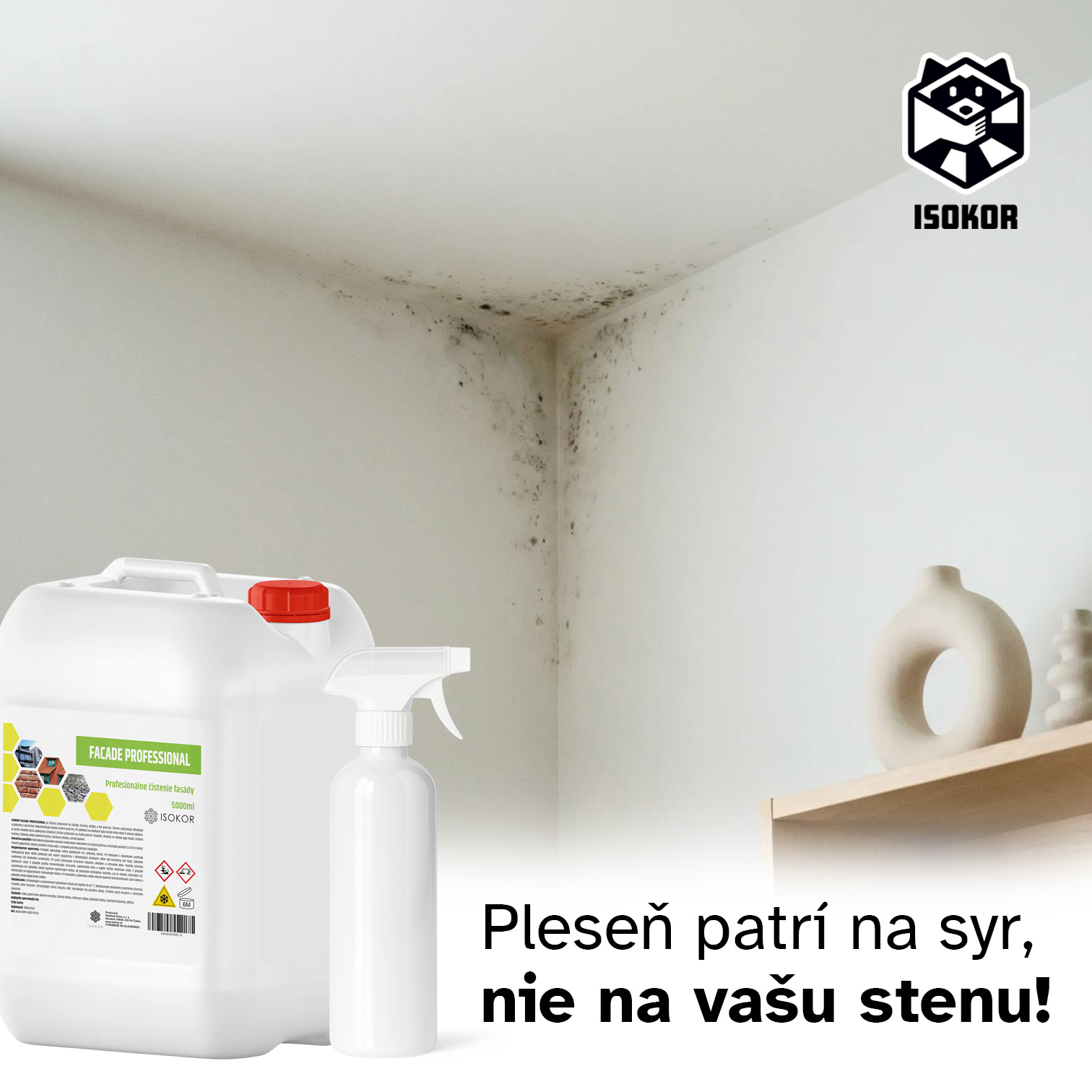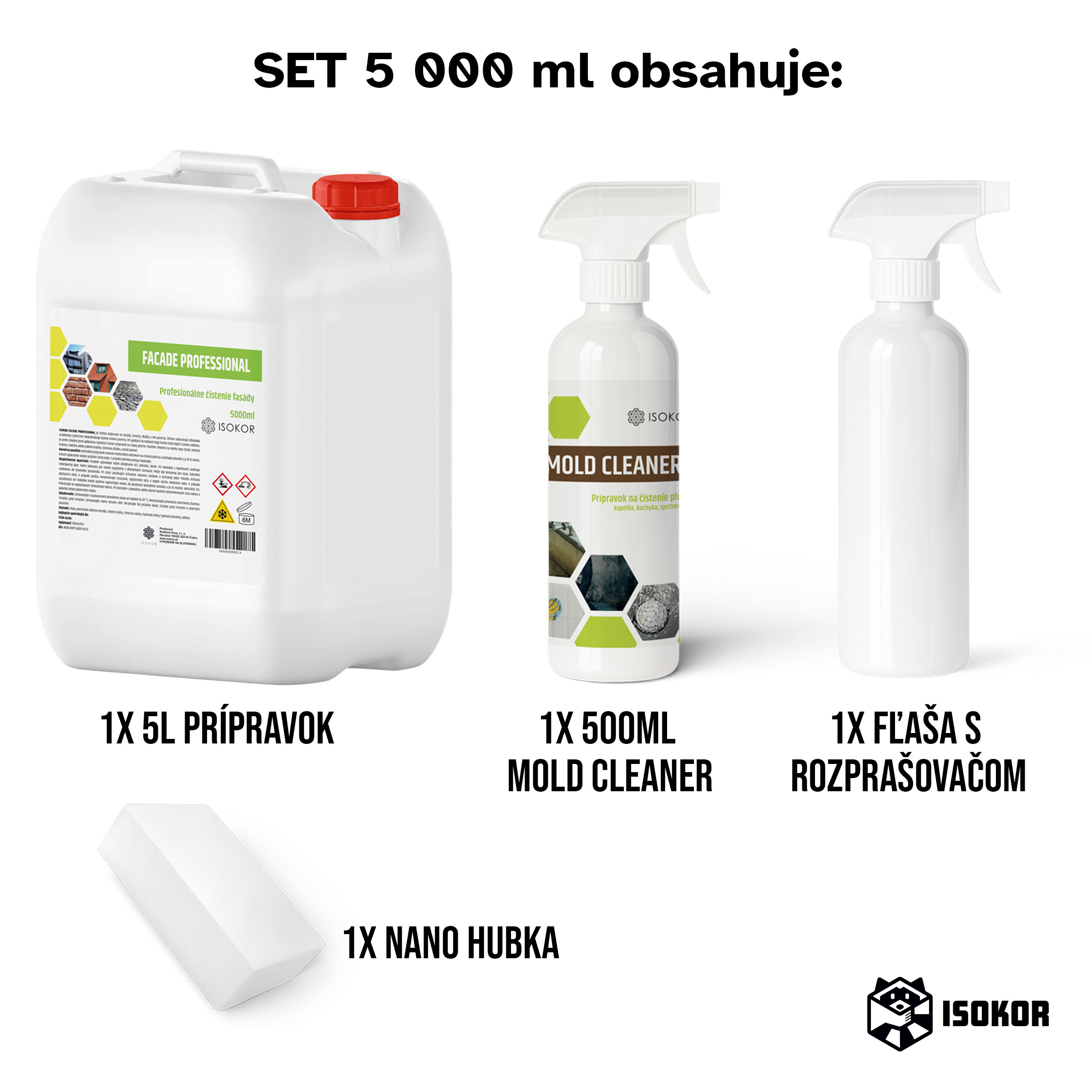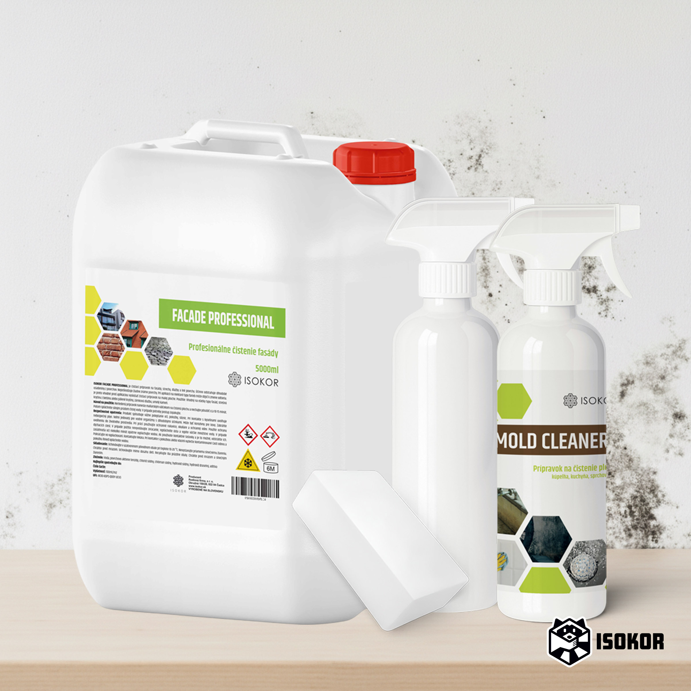 Isokor Set na odstránenie plesní je účinné riešenie pre každého, koho trápi pleseň na stenách v byte, dome, pivnici, kúpeľni, či garáži. Základom setu je silný čistič Isokor Facade Professional pôvodne vyvinutý na čistenie fasád, striech a dlažieb. Práve vďaka tejto sile dokáže mimoriadne efektívne odstraňovať plesne, huby, riasy a biologické znečistenie zo stien, omietok, muriva a betónu v interiéri aj exteriéri.